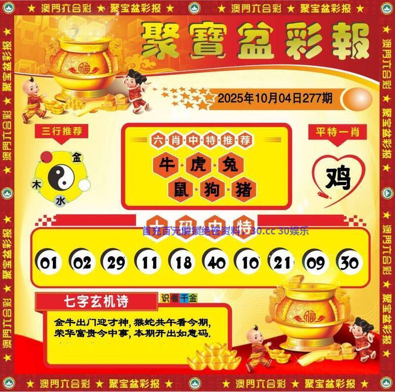 277期:七字玄机诗【金牛出门迎才神,猴蛇共午看今期。荣华富贵今中事,本期开出如意码。】